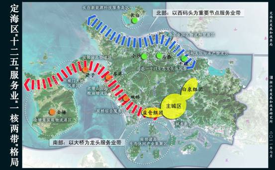 ■ 金塘集裝箱物流港區。重點發展集裝箱物流,兼顧發展大宗散貨物流。一是加快推進金塘北部圍墾和島內集疏運體系建設,重點實施大浦口、上岙、木岙、張家岙和小李岙等集裝箱作業區的碼頭泊位建設,提升港口通過能力。二是加快山潭、大豐等物流園區和西堠臨港產業區建設,拓展物流增值服務。爭取建成集國際貿易、物流分撥、倉儲展示、過境轉運、國際金融等綜合型自由貿易港區或海島型國際離岸型貿易基地。 ■ 舟山跨海大橋海洋風景旅游區。重點建設冊子島西南部和金塘島東北部兩個休閑功能區,形成海上休閑旅游區。一是結合冊子F3大眾賽車、溫泉度假等項目建設,打造冊子海洋康體旅游度假區。二是結合金塘灣商務酒店和大橋建設展覽館等項目建設,打造以商務展覽為主題的金塘灣度假旅游區。三是結合大鵬島新農漁村建設,加強民宅群和村落保護整治,形成具有濃郁海洋文化的大鵬島村樂居區。 ■ 西部油品物流區。一是推進中石化冊子原油碼頭二期建設,至2015年達到年吞吐量1億噸,成為油品中轉貿易儲存基地。二是以岑港煙墩、外釣區塊為核心區,以大型企業為支撐,以油品儲運銷售為重點,打造國家戰略油品儲運基地和商品油儲運銷售基地。 ■ 老塘山國際糧油物流區。依托老塘山國際糧油中轉加工基地,大力推進進口糧食減載市場、糧食中轉市場和飼料糧輻射市場等建設,積極發展糧食加工業務,打造糧食中轉加工配送基地。 ■ 雙橋綜合服務區。重點發展商貿、物流和旅游業。一是加快發展汽車4S貿易市場、糧油集散中心等各類新型商貿業態。二是以茶人谷生態旅游區為基礎,聯動開發石礁生態觀光園,打造雙橋生態旅游區。 (四)優化開發以西碼頭為重要節點的北部服務業帶 依托水產品加工、船舶修造、臨港石化等產業基礎,推進山海結合的自然人文資源開發利用,著力推進形成“三區一帶”的產業空間布局。“三區”即西碼頭國際水產物流區,定海工業園區物流和貿易區,以及長白新能源科技服務島區。“一帶”即馬岙—小沙—干石覽島村生態文化休閑帶。 圖表4??以西碼頭為重要節點的北部服務業帶
