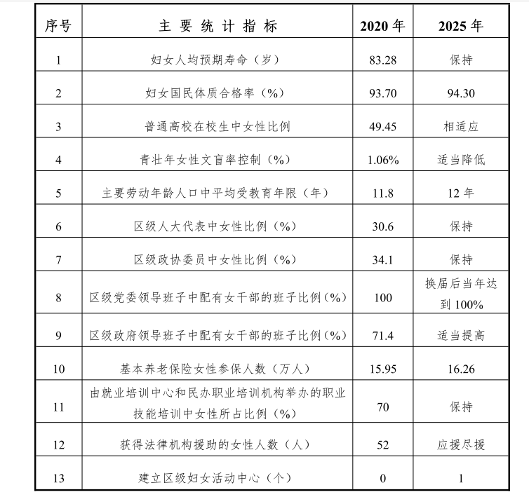 各鎮人民政府、街道辦事處,區屬各單位: 現將《定海區婦女發展“十四五”規劃(2021--2025年)》《定海區兒童發展“十四五”規劃(2021--2025年)》印發給你們,請結合實際,認真貫徹落實。 舟山市定海區人民政府? ?? 2022年6月20日? ? ? ? ? (此件公開發布) 定海區婦女發展“十四五”規劃(2021-2025) 為進一步推進“十四五”期間,我區婦女事業與經濟社會的協同發展,根據《浙江省婦女發展“十四五”規劃》、 《舟山市定海區國民經濟和社會發展第十四個五年規劃和二〇三五年遠景目標綱要》以及《舟山市婦女發展“十四五”規劃》的總體要求,制定《定海區婦女發展“十四五”規劃》。 一、總體要求 (一)指導思想 堅持以習近平新時代中國特色社會主義思想為指導,全面貫徹落實黨的十九大和十九屆三中、四中、五中全會精神,堅持黨對婦女事業的全面領導,圍繞建設“四個舟山”,展示“重要窗口”海島風景線,以人的現代化為導向,深入貫徹實施男女平等基本國策,進一步發揮婦女作用,增強婦女整體素質,優化婦女發展環境,推動婦女事業高質量發展、婦女權益高水平保障,實現婦女全面發展、兩性平等發展、婦女與經濟社會同步協調發展,為爭創高質量發展建設共同富裕示范區港城標桿貢獻巾幗力量。 (二)總體目標 “十四五”期間,我區將積極探索構建家庭友好型社會,規劃婦女事業高質量發展路徑,推進婦女在經濟社會參與、身心健康、科教文化、權益保護、家庭建設、社會環境等方面獲得更加平等、全面的發展,進一步提升定海婦女的獲得感、幸福感和安全感,團結帶領全區廣大婦女積極投身定海區社會主義現代化共同富裕示范樣本實踐。到2025年,定海區婦女發展綜合水平達到市內領先,婦女事業發展成為“重要窗口”海島風景線展示的重要組成部分。 定海區婦女發展“十四五”規劃重點指標目標表 二、發展領域的目標措施 (一)婦女與家庭建設 1.樹立新時代家庭觀,切實將社會主義核心價值觀融入家庭生活。樹立新時代家庭觀念,注重家教家風建設,弘揚社會主義核心價值觀,傳承中華優秀傳統文化和定海精神,引導培育愛國愛家的家國情懷,建設相親相愛的家庭關系,倡導尊老愛幼、男女平等、夫妻和睦、勤儉持家、鄰里團結的家庭美德,推動社會主義核心價值觀融入家庭生活。 2.重視發揮婦女在家庭文明建設中的獨特作用。繼續深化“平安家庭”活動,推動“四必訪”走深走實,不斷完善定海區家庭建設綜合平臺。深入開展家庭文明建設、家庭教育推進、家庭平安保障、家庭發展共促、家庭服務提升五項行動計劃,引領家庭踐行綠色、低碳、循環、可持續的生活方式。 3.倡導構建平等、和睦、文明、穩定的婚姻家庭關系。以社會主義核心價值觀為引領,充分發揮家庭家教家風的重要作用,優化提升“娘家人”品牌,形成上下貫通、城鄉一體、社會化的婚姻家庭指導服務體系,為婦女和家庭提供婚姻指導、矛盾調解、法律援助、家庭幫扶等服務。有效提高婦女營造幸福婚姻、建設美滿家庭的能力,引導建立和維護平等、和睦、文明的婚姻家庭關系。加強面向家庭、維護家庭成員權利的普法宣傳,落實司法保護、法律援助和社會救助工作。推進移風易俗,培育健康文明的婚俗文化。積極搭建大眾婚戀平臺,加大社會婚戀活動和婚戀服務。 4.充分發揮婚姻家庭糾紛預防化解機制作用。要充分發揮家庭糾紛預防化解機制作用,積極推動婚姻家庭糾紛調解納入社會矛盾大調解格局,打通矛盾糾紛化解綠色通道。加強婚姻家庭糾紛預測預防預警,健全糾紛排查調處制度。宣傳倡導對家庭暴力零容忍理念,依法處置家庭矛盾糾紛。加強網格平臺在家庭糾紛化解的作用,以異常家庭風險識別管控和婚姻家庭矛盾糾紛排查化解為切入點,推動家庭問題動態管理機制。 5.促進男女平等分擔家務。促進男女平等分擔家務,倡導夫妻在家務勞動中分工配合,共同承擔照料陪伴子女老人、教育子女、料理家務等家庭責任。提升3歲以下嬰幼兒和失能失智老年人照護工作,推動家政服務進社區,不斷提供家政、養老、托育等服務,實現現代家政服務業提質擴容。不斷提高照料、保潔、烹飪等家務服務水平,加快縮減家務勞動時間。 6.促進男女平等和婦女全面發展的家庭政策體系環境建設。全面推進男女平等工作,充分尊重和維護婦女權益,使男女平等的理念更加深入人心。深入落實家庭發展政策評估機制,對家庭發展政策和影響家庭發展的相關政策進行研究和評估,為保障家庭健康發展提供依據。不斷優化婦女發展環境,婦女合法權益得到切實保障。 7.提升老年婦女家庭生活質量。倡導養老、孝老、敬老的家庭美德,支持家庭履行贍養老人的主體責任,鼓勵夫妻雙方與老年人共同居住或就近生活。推動建立子女陪護假制度,建立完善社區老年人關愛服務機制,加強智慧技術無障礙建設,落實線下服務途徑。發揮好海島驛站對口幫扶功能,為基層婦女提供交流聯系、咨詢服務和資源對接。依法保障老年婦女的婚姻自由和家庭財產權利。 8.增強家庭家教家風在基層社會治理中的作用。加快構建完善黨委領導、政府主導、部門合作、家庭盡責、社會參與的家庭建設工作新格局。將建設好家庭、實施好家教、弘揚好家風、新時代文明實踐中心納入基層社會治理體系以及基層社會