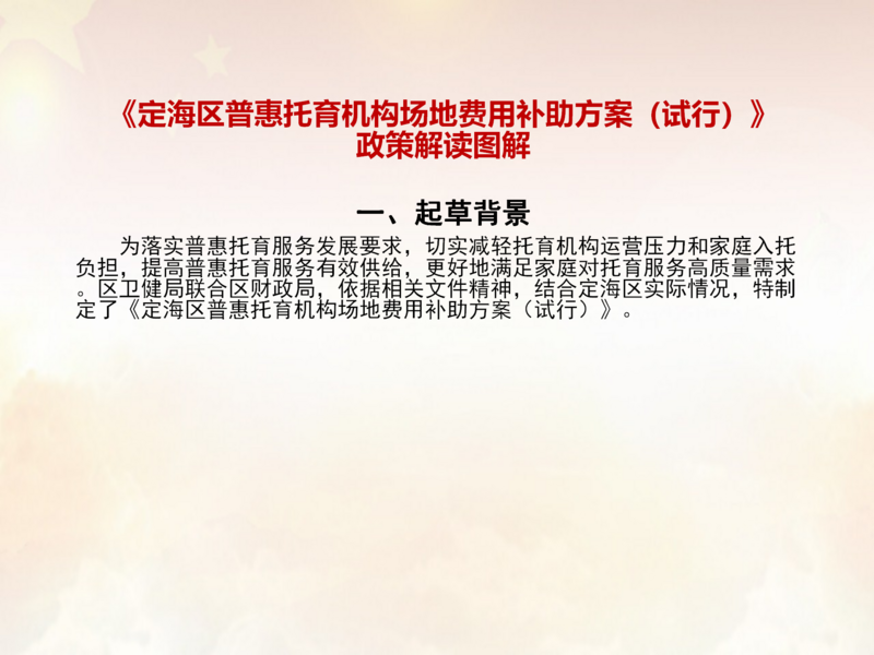 | (圖解)《定海區(qū)普惠托育機(jī)構(gòu)場地費(fèi)用補(bǔ)助方案(試行)》政策解讀 | ||