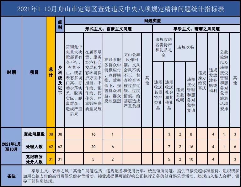 2021年1-10月,全區(qū)各級紀(jì)檢監(jiān)察組織共查處違反中央八項規(guī)定精神問題38起,處理62人,給予黨紀(jì)政務(wù)處分31人。其中: