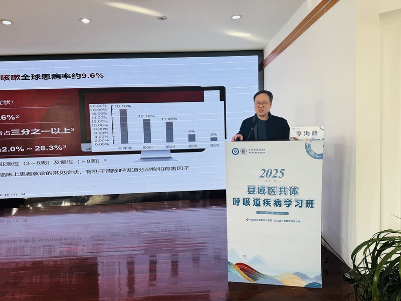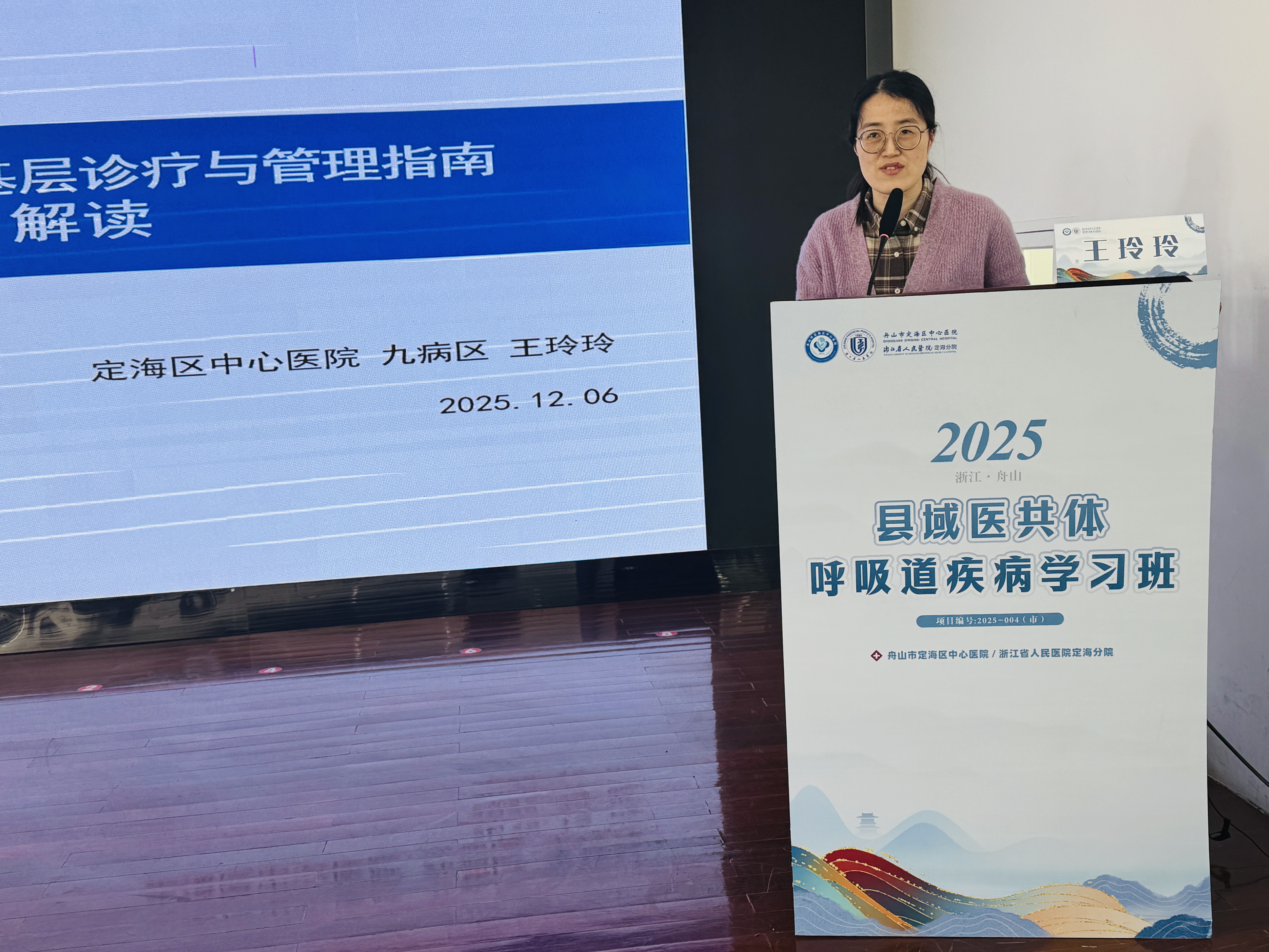 隨后,舟山醫院李海峰主任聚焦 “慢性咳嗽的規范化診治”,系統梳理了慢性咳嗽的常見病因、診斷流程及個體化治療方案,破解了基層臨床中慢性咳嗽診療的難點問題。 舟山市定海區中心醫院的專家團隊也帶來了干貨滿滿的分享。王玲玲副主任醫師對《中國慢性阻塞性肺疾病基層診療與管理指南》進行深度解讀,結合基層醫療實際,強調了慢阻肺的早期篩查、長期管理及康復治療的重要性;
