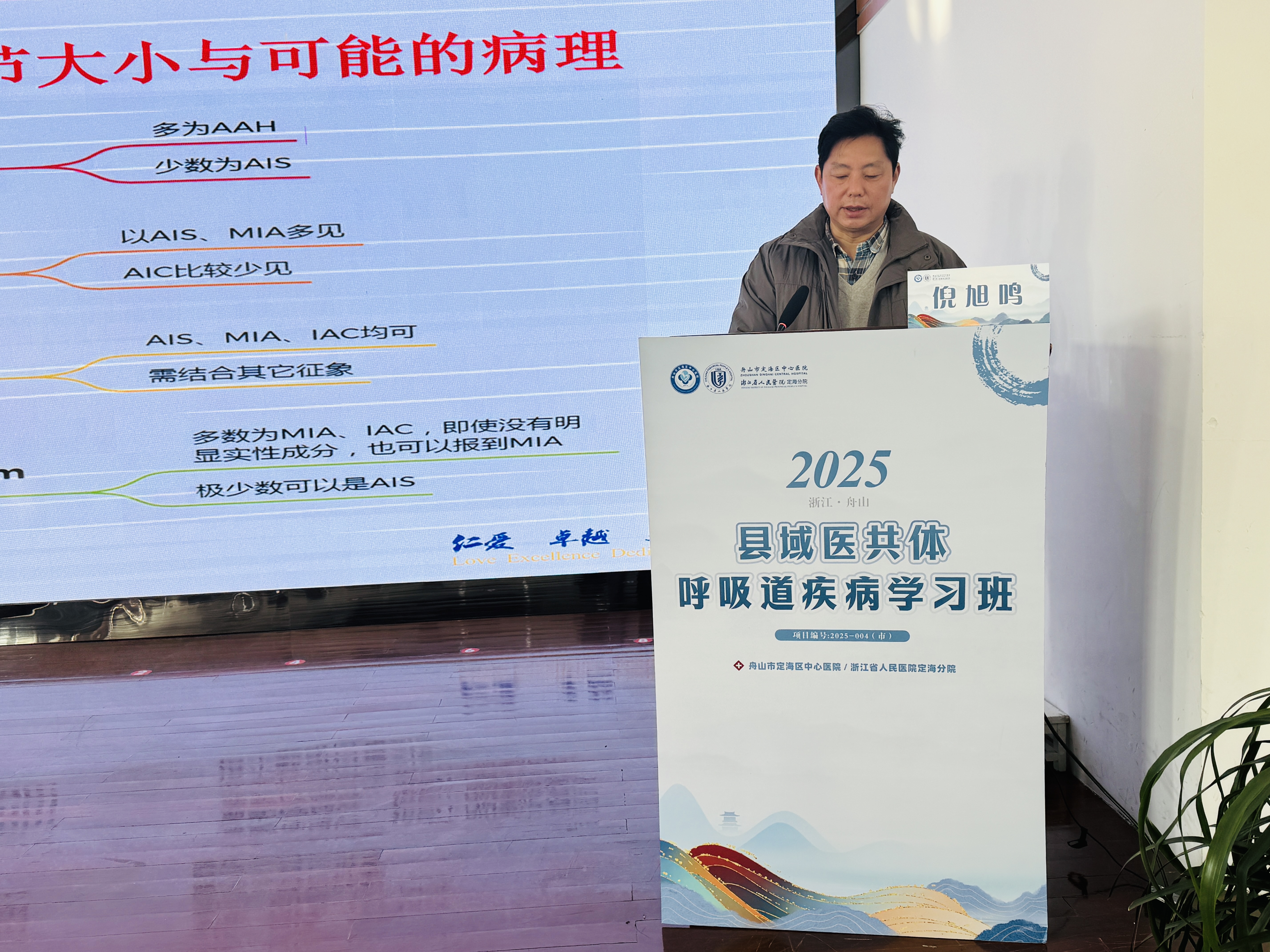為規范縣域醫共體呼吸道疾病診療流程,提升基層醫務人員專業技術水平與臨床實踐能力,2025年12月6日,由舟山市定海區中心醫院(浙江省人民醫院定海分院)主辦的“縣域醫共體呼吸道疾病學習班”在五樓學術報告廳成功舉辦。本次學習班吸引了縣域醫共體及周邊基層醫療機構醫護人員的積極參與。開班儀式由九病區主任王玲玲主持。 浙江省人民醫院下沉專家倪旭鳴主任授課,其講座主題為“良惡性肺結節的判別”。倪主任醫結合臨床典型案例,系統闡釋了肺結節的影像學特征、鑒別診斷要點及最新診療進展,為基層醫生精準判別肺結節性質提供了實用指導。